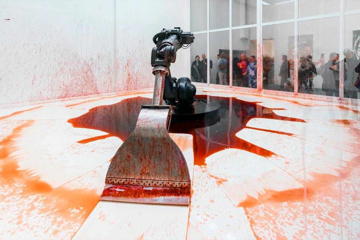 Can’t Help Myself was shown again at the Venice Biennale in 2019 where the anthropomorphic robot was clearly beginning to decay. The once pristine glass cube became covered in red, the machine was rusting, and the arm moved at a much slower rate. The name, Can’t Help Myself, is now even more fitting as the robot seems to wish to stop at its old age, but is not able to.